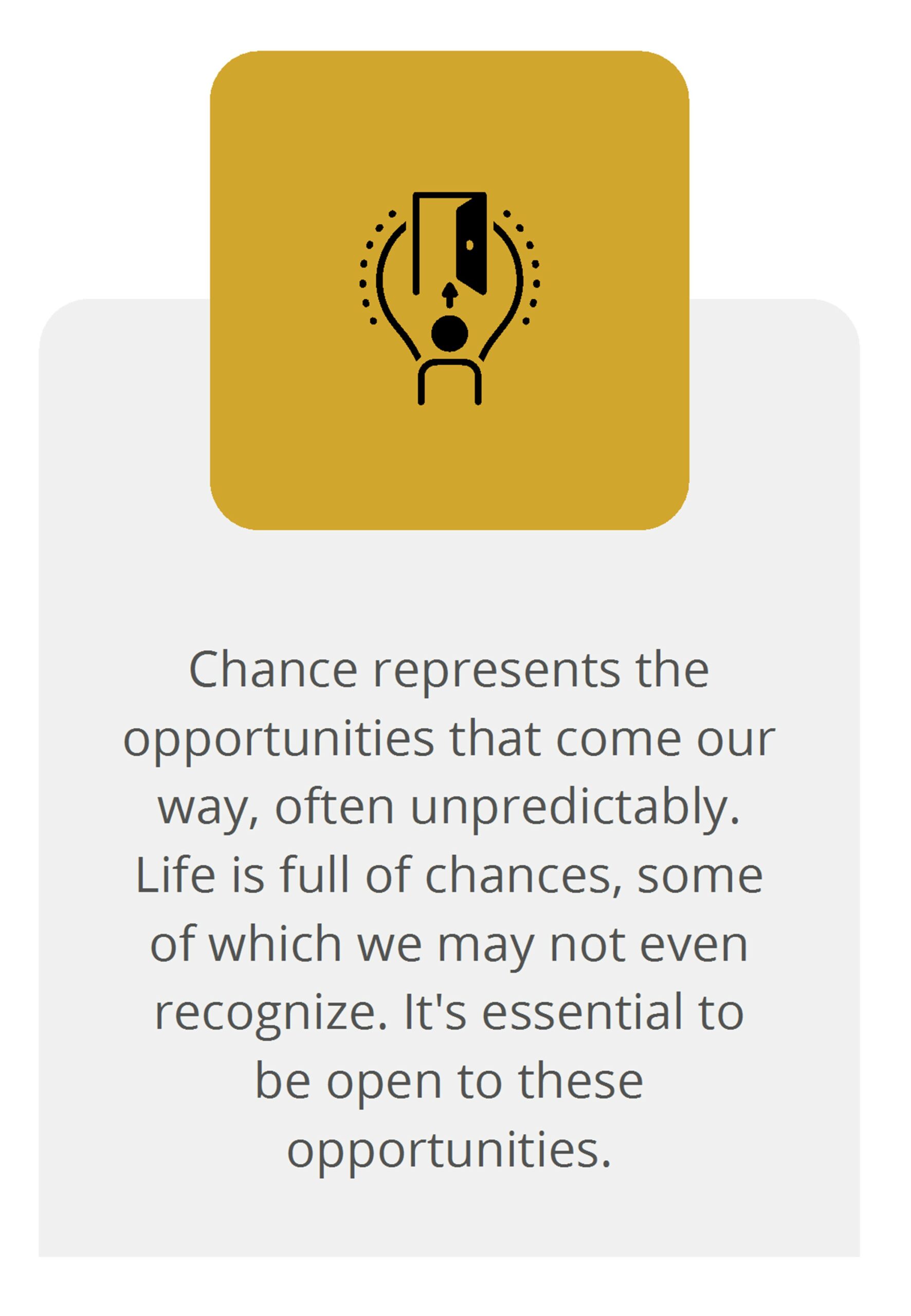 - Chance represents the opportunities that come our way, often unpredictably. Life is full of chances, some of which we may not even recognize. It’s essential to be open to these opportunities.